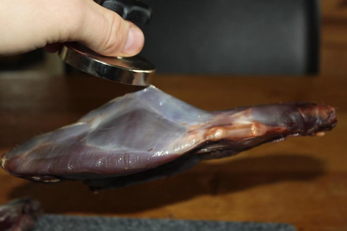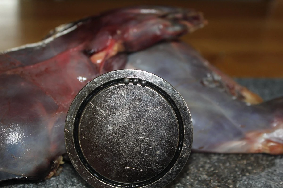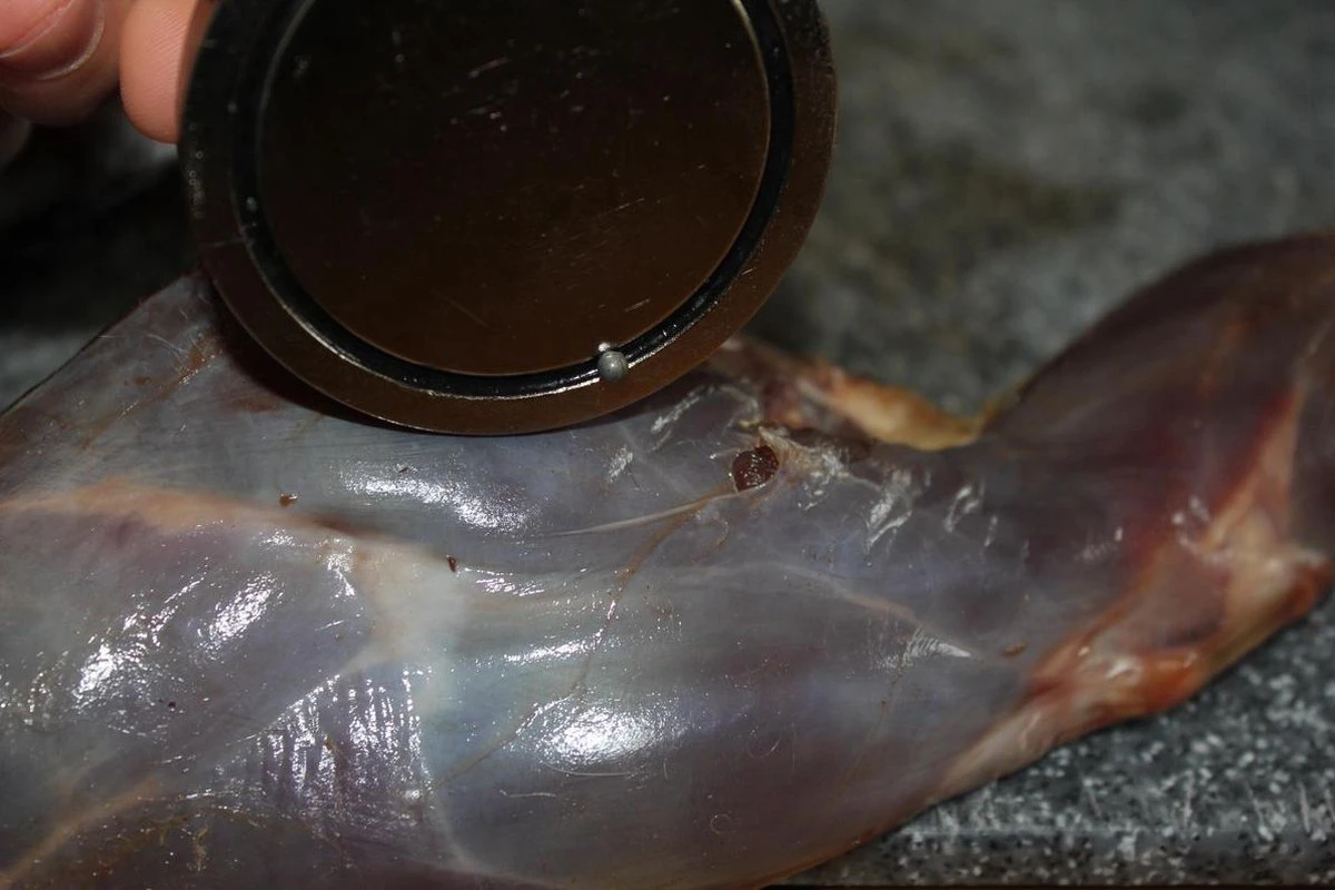 Deze magneet is geschikt om hagel korrels uit vlees te verwijderen. Dek de magneet af met wat folie en ga langzaam over het vlees heen om het hagel te verwijderen.