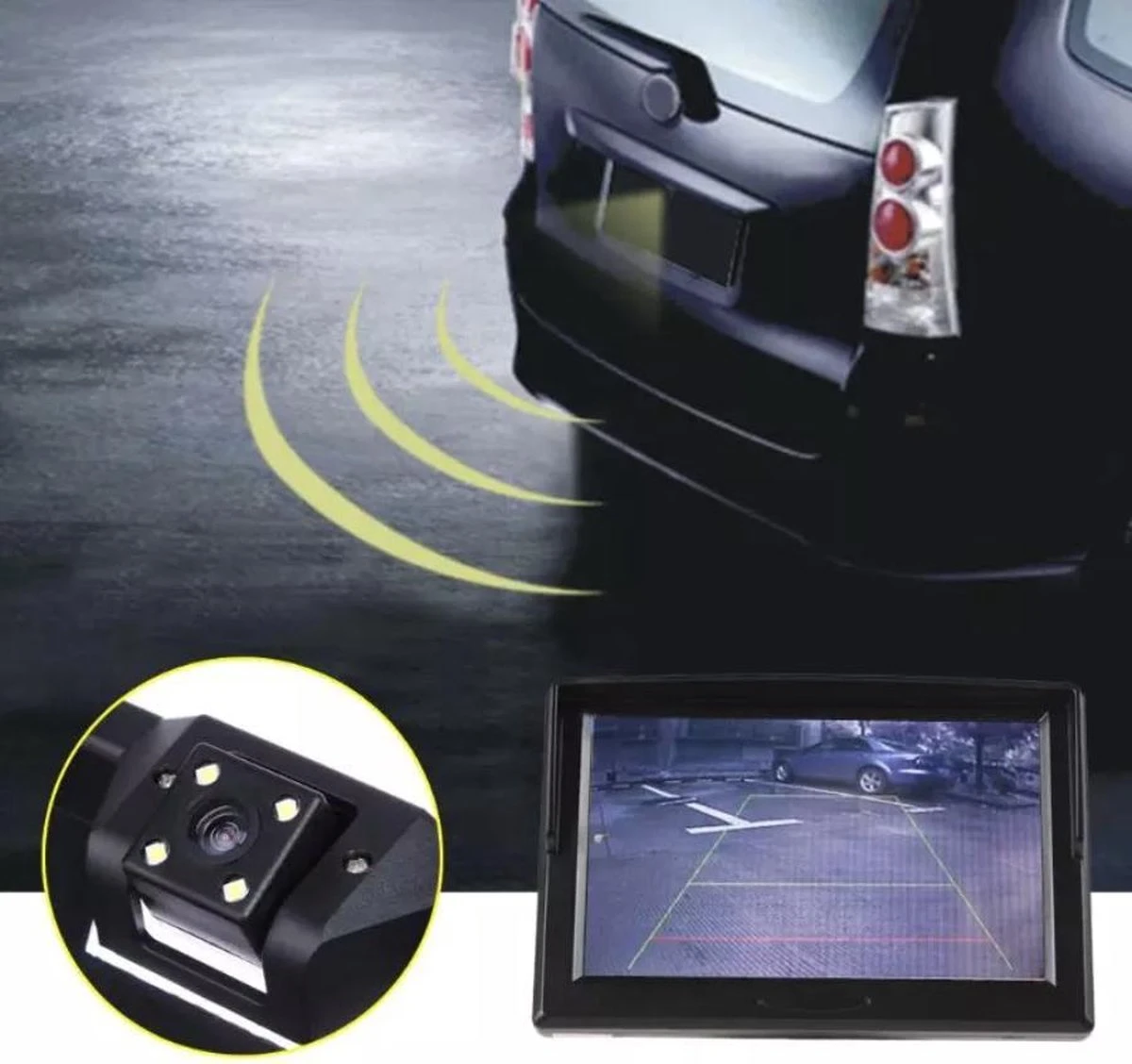 Achteruitrij camera met Europese kentekenplaathouder. Geeft een normaal helder beeld in de avond/nacht door middel van 4 ledjes die rondom de camera lens zitten. Aan te sluiten op alle monitoren en autoradio’s voorzien van LCD scherm met AV aansluiting (met PAL ondersteuning). Achteruitrijcamera in de nummerplaathouder, eenvoudig te installeren aan de achterzijde.