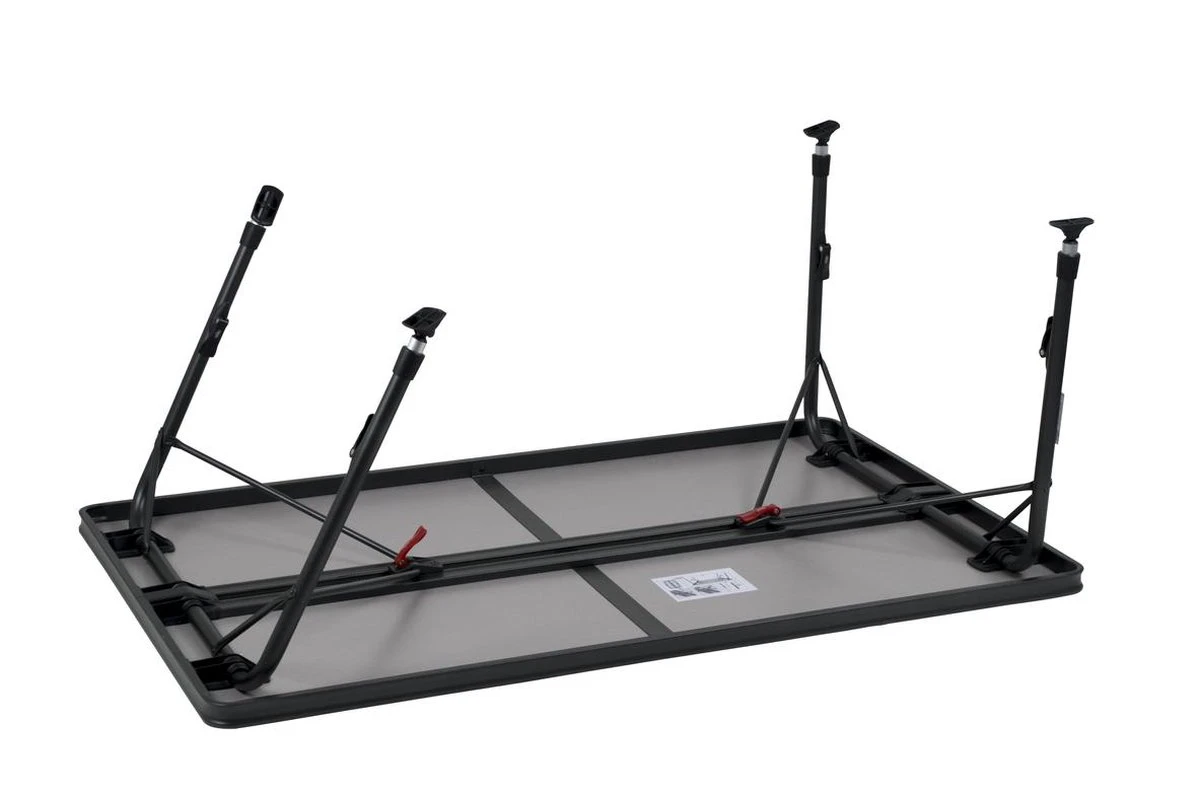 Een zeer stabiele tafel van hoge kwaliteit. Dankzij de speciale constructie is deze tafel eenvoudig in- en uit te klappen. Daarnaast zijn de poten na het inklappen stevig te bevestigen in de geleide aluminium rails aan de onderzijde van het tafelblad. Het tafelblad is extra ruim zodat deze plaats biedt tot 6 personen. De aluminium rails aan de onderzijde van deze campingtafel zorgt eveneens voor extra versteviging. De hoogwaardige materialen en het hittebestendige en watervaste tafelblad zorgen voor een lange levensduur. De poten bieden een hoge stabilteit door de dikke (28 mm) en extra verstevigde buizen. De stabilisatie voetjes zorgen voor extra grip op iedere ondergrond. Deze tafel is licht van gewicht door het aluminium frame.
