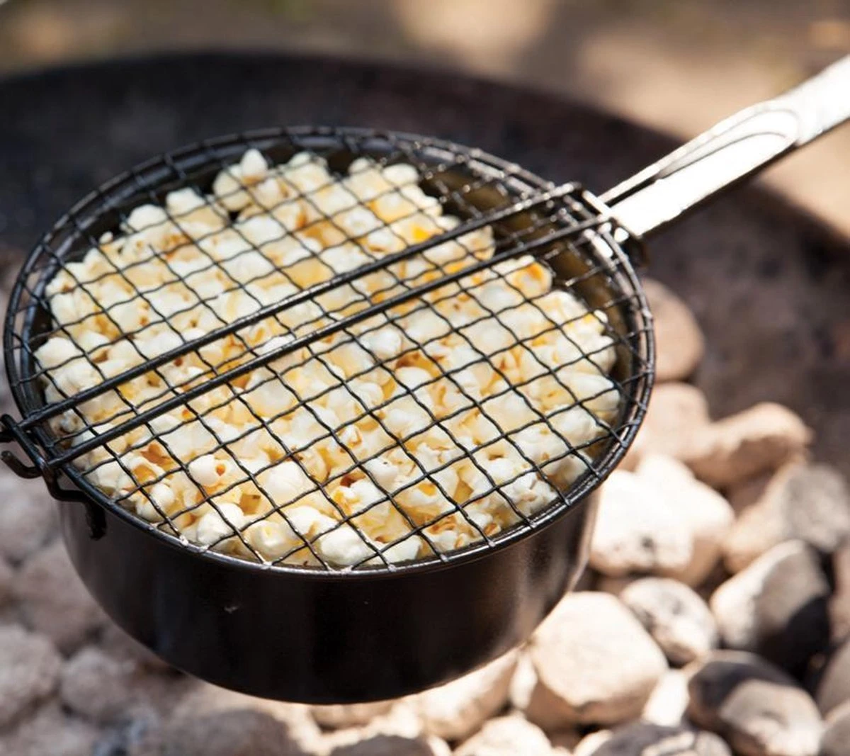 Een popcornpan speciaal voor outdoor gebruik zoals tijdens een kampvuur. Met een extra lange steel zodat de pan gebruikt kan worden bij open vuur en veilige afstand biedt tot de vlammen. Gemaakt van een dunne plaat staal speciaal voor outdoor gebruik. Eenvoudig op te hangen door middel van oog aan het uiteinde van de steel. Echt voor de mensen die ’s avonds bij het kampvuur iets lekkers te eten willen hebben.