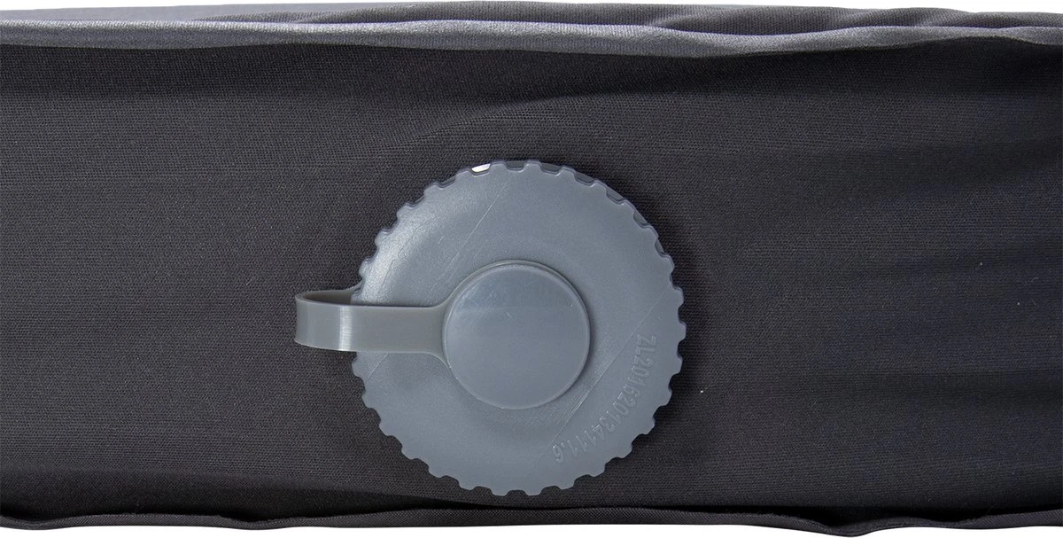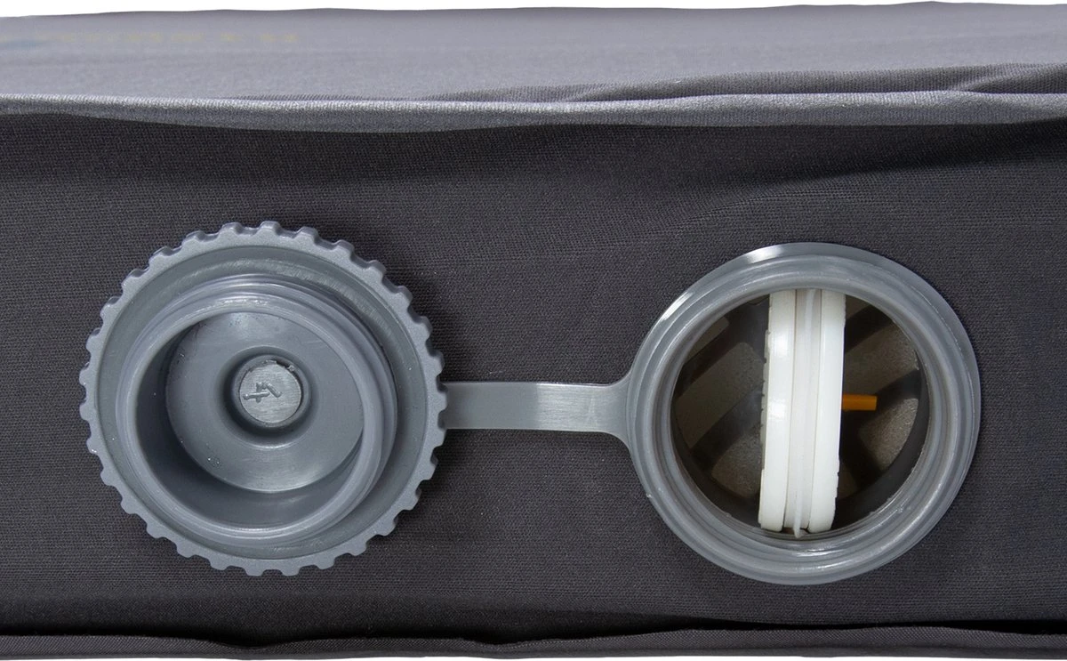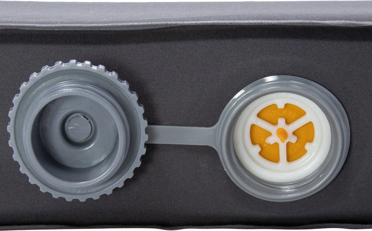 Deze mat heeft één groot ventiel waarmee je de mat zowel opblaast als leeg laat lopen. Het ventiel heeft 3 standen: Open, inflate (om bij te blazen, met het oranje gedeelte aan de binnenkant) of deflate (met het oranje gedeelte aan de buitenkant). Je draait ‘m gemakkelijk met je vinger naar de gewenste stand.